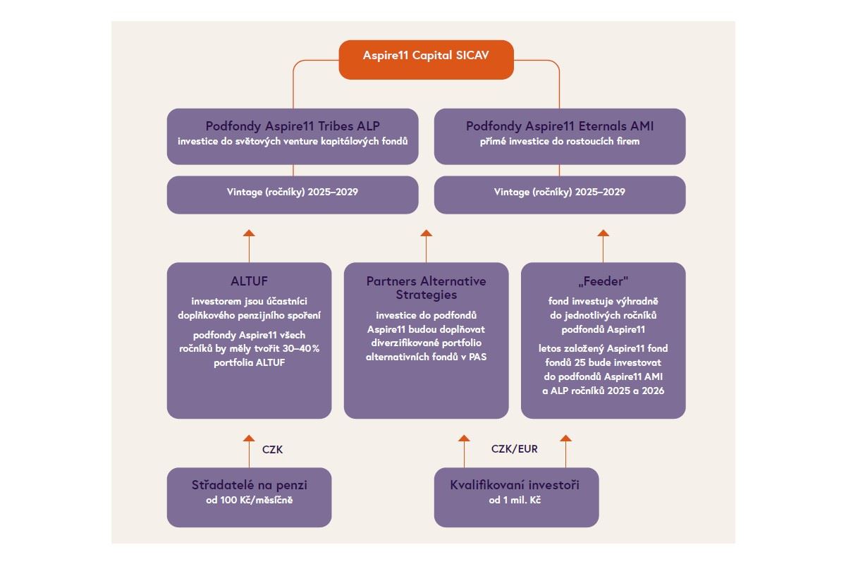 Pro kvalifikované investory (FKI): Partners investiční společnost nabízí 2 fondy kvalifikovaných investorů (FKI), které budou investovat do Aspire11. Prvním je Partners Alternative Strategies, kde je cílem mít 30–40 % portfolia v Aspire11. Druhým je tzv. „feeder“ Aspire11 fond fondů 25, který investuje 100 % peněz do podfondů Aspire11 Capital SICAV, a.s., ročníků 2025 a 2026.