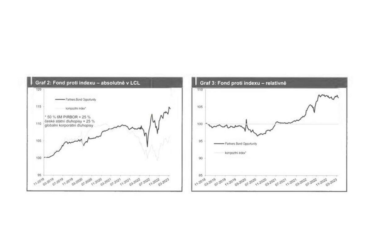 Grafy 2 a 3 srovnávají korunový výnos fondu od jeho založení s výnosem kompozitního indexu, který tvoří z 50 % sazba 6M PRIBOR, z 25 % index českých státních dluhopisů a z 25 % index globálních korporátních dluhopisů. Tento kompozitní index není benchmarkem fondu a slouží tak jen velmi orientačně jako ukázka toho, jak si fond vedl vůči složenému indexu, který rovněž dává značnou část hotovosti a dále kombinuje různé dluhopisové investice.